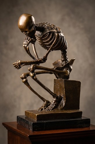 Philosophische Totenkopf-Skulptur mit verhüllten Sinnen - ein kraftvolles Memento Mori.