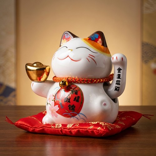 Die Maneki Neko, Japans berühmteste Glückskatze, präsentiert sich hier in strahlend weißem Porzellan mit traditionellen Verzierungen. Auf ihrem roten Samtkissen thronend, winkt sie mit ihrer erhobenen Pfote dem Betrachter freundlich zu - ein jahrhundertealtes Symbol für Wohlstand und Glück, das in nahezu jedem japanischen Haushalt und Geschäft zu finden ist.