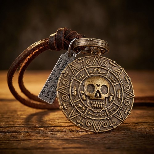 Ein mystisches Amulett, inspiriert von den legendären Goldmünzen der Karibik. Das bronzefarbene Medaillon zeigt einen kunstvoll gestalteten Totenkopf, umgeben von aztekischen Symbolen und geheimnisvollen Zeichen, die an versunkene Schätze und maritime Abenteuer erinnern.